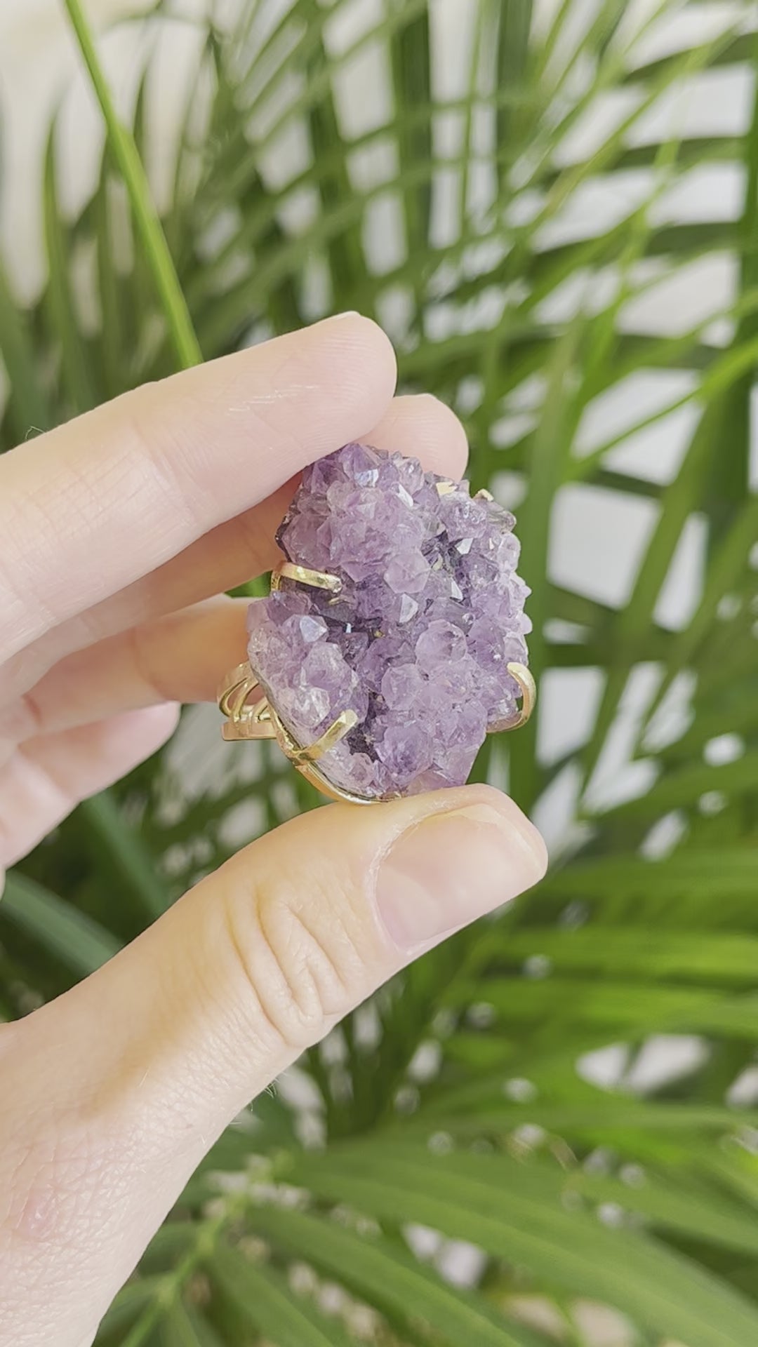 Experience the elegant and timeless beauty of our Big Geode Amethyst Ring. Each ring is a unique expression of natural beauty, showcasing the mesmerizing patterns and hues of the amethyst geode.