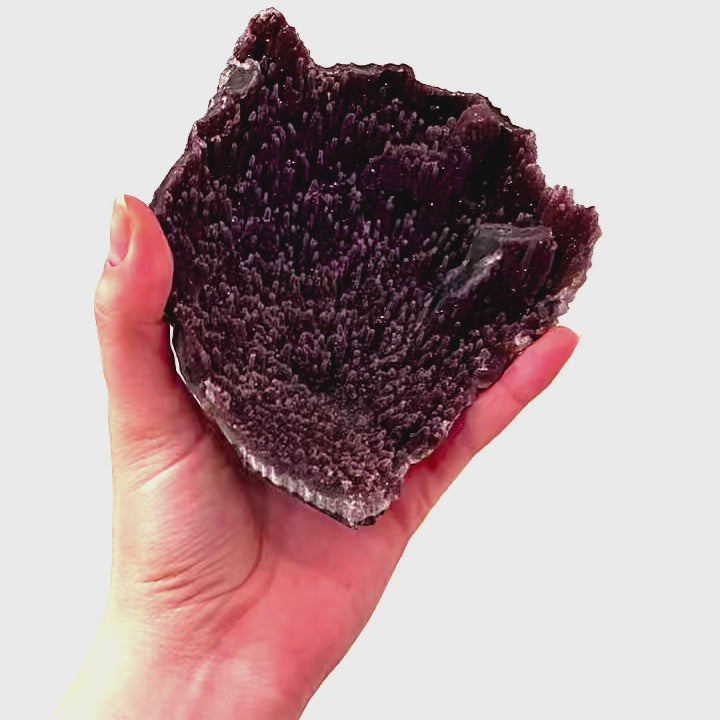 Elevate your space with Maroon Frost, a dark Red Druzy Amethyst. The deep reddish hue symbolizes passion and strength, while the sparkling druzy surface adds shimmering warmth. Known for promoting emotional healing and clarity, this piece is perfect as a meaningful gift or a powerful highlight to your space.
