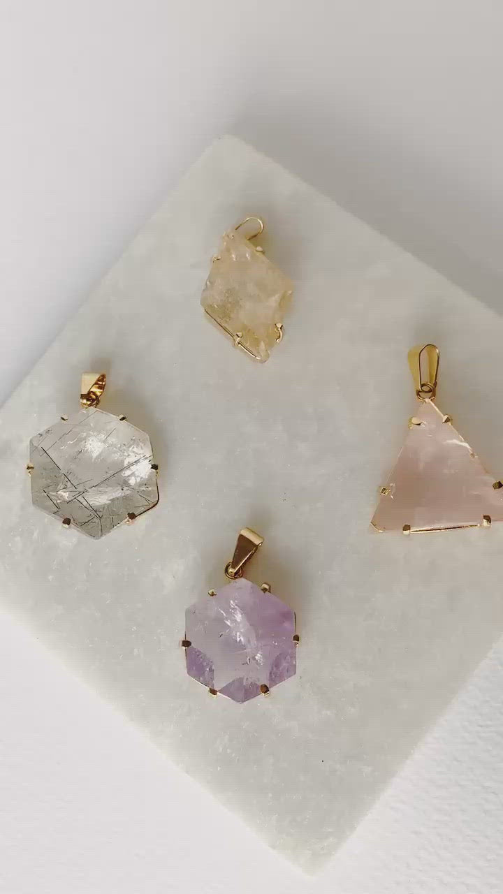 And variants of stones: Amethyst, Rutilated Quartz, Rose Quartz and Citrine. First, choose the shape. Second, choose the stone.